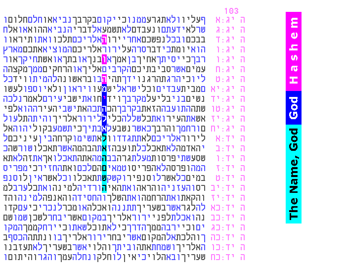 Figure 21a Layman's verification: Figure 21a is a same-column code, and its significance is higher than 1:100,000. This can be verified by a layman by doing a few multiplications, as follows. First, we note that in the same-column format, the position of Elokim (dark blue, translated in the figure as "G-d") relative to "The Name, G-d" is in the best position possible (the two ELSs form a single string, and both are in the same direction). Elokim contains 5 letters. Let's estimate conservatively and say that each of the 5 letters has 1 chance in 10 of appearing exactly where we see it (why this is conservative). The whole word Elokim appearing where it does therefore has chances of 1/10 multiplied by itself 5 times, for a total estimate of 1:100,000 for this meeting alone. This multiplication is legitimate only because the first code (Figure 20a) defined for us what to look for in the second code (Figure 21a), with very few alternatives. We actually need to decrease the estimated significance due to these alternatives (for example, Hashem could have appeared as an extension, instead of Elokim). And we decrease the significance further because our starting ELS, "The Name, G-d" (at skip 103 in the table) is not the minimal skip ELS for this expression - there are 12 ELSs for "The Name, G-d" with skips smaller than 103. But these decreases are more than balanced by an increase in significance due to the presence of Hashem so close by in the same column. In fact, computer runs give results in the same ballpark as our initial estimate. When we have the computer compare this Torah result to thousands of monkey texts using the same-column criterion, we find a more compact monkey text arrangement for the 3 expressions (The Name, G-d; Elokim; Hashem) only 4 times in 500,000 trials. This result, combined with the Kal result, bring these new discoveries beyond the level of 1:1M. There are other possible ways of looking for Kal and for "The Name, G-d", which may or may not succeed, but what we have tried so far are among the most obvious ways of checking. It is interesting to note the following additional phrases in Figure 21b below. These phrases appear in the plain text that surrounds the new code (we do not assign probabilities for such crossing phrases, but we do notice them):