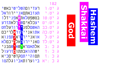Figure 2a From a technical viewpoint, this is very strong, because there are almost no parameters needed to find such a table. And (in the current case) the Tetragrammaton is certainly near the top of the list of high-relevance key words. There are a handful of cases of the Tetragrammaton forming this kind of maximum interlocking pattern in the Torah. All of them are interesting and are being prepared for display on this site. The above case is positioned precisely at the same special spot originally found in Figure 1, the spot where the other Names of G-d are clustered. There are 9,686 other spots in the Torah (vertical ELSs for the Tetragrammaton with skip less than or equal to 182, our case). Why should this maximum interlocking case (and the other ones in preparation) be so interesting if there was not some kind of intention behind them? More repetition We also see this new phenomenon of maximum interlocking compactness in other codes, for example in Figure 5 here, and in Figure 2b, below. We found Figure 2b by looking for 5 occurrences of the Tetragrammaton rather than 6. Note the amazing triple emphasis in the code on the added word "your G-d" [singular your], very similar to Figure 2. Note also the plain text running through it, in yellow, from Deuteronomy 16:2, "the place where Hashem will choose to rest His Name".
