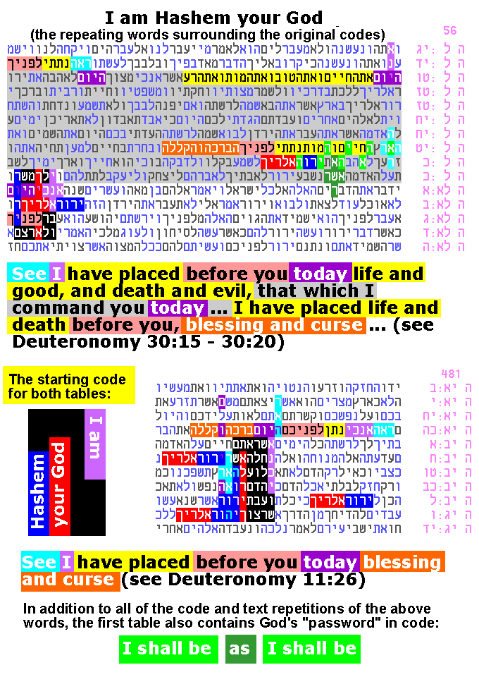 More codes about God May 2010: Our simplest and most relevant codes to date - codes using the Names of God - have now joined the 1-in-a-million club. We can say this with confidence because we are now able to validate the codes phenomenon as never before, due to advances in making our experiments "parameter-free" (i.e. free of subjective choices). See Figure 18 below. To review how we got here: In January 2010, we looked at a variety of cases which continue to be interesting side travels off the main road exploring Hashem's Names (see Figures 1-5 here). In February 2010 we looked at some codes that directly arise from the original page with Hashem's Names. On that page, the codes repeatedly made the following associations: (a) The Tetragrammaton, with (b) "I am Hashem your God", with (c) "I shall be as I shall be". We took a new look at Figure 11 from that page, and we saw these associations are strongly established yet again as follows (see the 3 newly highlighted yellow and green words below, thanks to subscriber Tim Brooks): Figure 11a Figure 11/11a combines the words for "Hashem" and "your God" into a single ELS. We also "took a fork in the road" and searched for these words separately (along with "I am"). The result is that we can "see" (literally) that this phrase again appears in uncanny locations (introduced, repeatedly, by the imperative "see" in Figures 12 and 13). Tim Brooks also found that the new instance of the Tetragrammaton, in yellow in Figure 11a above, is part of another maximally compact interlocking arrangement of 6 instances of the Tetragrammaton, shown below in Figure 14. March 2010 - update The code that launched this whole series was presented in Figures 1, 2 and 2a on the previous page and these ELSs are combined in the Figure below as a reminder: A combination of Figures 1, 2 and 2a This table is simply a combination of: (a) a special kind of cluster of Hashem with (b) the Names of God emphasized in Exodus. That is, the 3 Names mentioned in Exodus 6:2-3 (in red) are immediately adjacent to a "Hashem cluster" (in blue; the cluster itself being a maximally compact interlocking set of 6 ELSs for the Tetragrammaton). Tim Brooks and I recently found the only other such clusters in the Torah conatining 6 occurrences of the Tetragrammaton, with skip less than 500, in Figures 14 and 15 below. Figure 14 What do we have here? A repetition of the same elements, the same code design, as in Figures 1, 2 and 2a above: (a) the same kind of special cluster of Hashem with (b) the Names of God emphasized in Exodus. That is, the ELSs in Figure 14 repeat all of the words used to describe Hashem in Exodus 3:14-15. These might be called an "expanded password". In these verses, Moses is asking Hashem, in effect, "who shall I say sent me, so that the people believe me?". Hashem replies "I shall be as I shall be [see blue cluster above]. Further, tell them 'Hashem [see red cluster above], the God of Abraham, Isaac and Jacob [see yellow phrase in the text] sent me to you' ". The blue cluster is the best in Torah, given the constraint that the axis must have a skip of 120, and the yellow phrase is one of only three such phrases in the Torah. The fact that these nearly one-of-a-kind instances come together in the same table contributes to the probability being more significant than 1:10,000 for this result alone. Here is the other Hashem cluster: Figure 15 All 4 of the horizontal occurrences of Hashem are followed by "your God" (plural and singular "your"). In addition, we find the best 1D meeting of "I shall be" + "your God", and the best 1D meeting of "Hashem" + "Hashem our God". Once again we have several individually one-of-a-kind phenomena converging in the same table. April 2010 - update There were several forks in the roads travelled until now (for example a choice whether to search for a single long ELS or a series of shorter parallel ELSs). We now return to a few partially explored forks in the main road, and explore additional paths that we initially did not take. First, we look for the original key words from Figure 1, but we combine Hashem/God, and look for it in combination not only with Shakkai, but also with the Hebrew word for I shall be. Figure 16 The result in Figure 16 contains the best parallel meeting in Torah of these expressions. It simply starts with the minimal skip in Torah for Hashem/God. Additionally, it contains 3 more occurrences of "Shakkai", forming the best such Shakkai cluster in Torah, given the constraint of the table's skip (there is also a "Hashem" mini-cluster in yellow, of lesser significance but interesting.) Next, we look for the same key words as above, but with the full expression I shall be / as / I shall be. This does not yield an interesting result. Finally, we look for Hashem, Your God and the full expression I shall be / as / I shall be. Figure 17 This combination forms a significantly compact area (highlighted box in pink in Figure 17, used to measure the significance). Also highlighted (as an aside, since they are subjectively relevant) are related phrases surrounding this box which contain Hashem your God. One of these is very familiar, "the place where Hashem your God will choose to rest His Name" - see again Figure 2b from the previous page). May 2010 - update The main results for Hashem's Names are now quantifiable. The combined strength of Figure 11a and Figure 16 had only 1 competitor in 100,000 comparison texts. These two Figures were combinable in a single experiment that searches for the set of all meaningful combinations of our initial key words, centered around an axis built from all significant pairs of these key words. This result was obtained by specifying only the key words to be used. The computer program now "choose its own parameters" automatically, based on how often the specified key words appear together in typical "monkey texts". The main dimensions, for example, shown below, comprise most of those parameters, and th