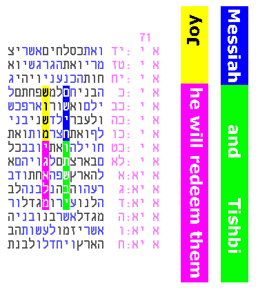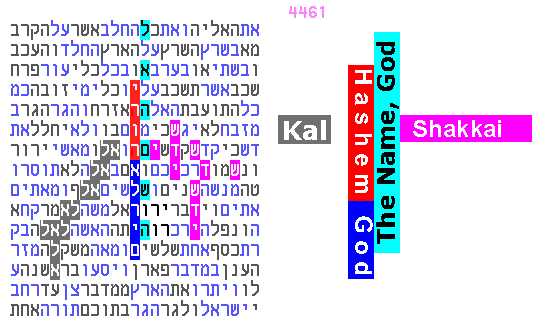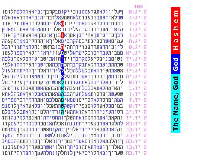 The light blue phrase above (The Name, G-d), foretells that the axis key words, Hashem G-d/Elokim, may appear elsewhere with another occurrence of the same light blue phrase. The following code fulfills this to the tune of 1:100,000: