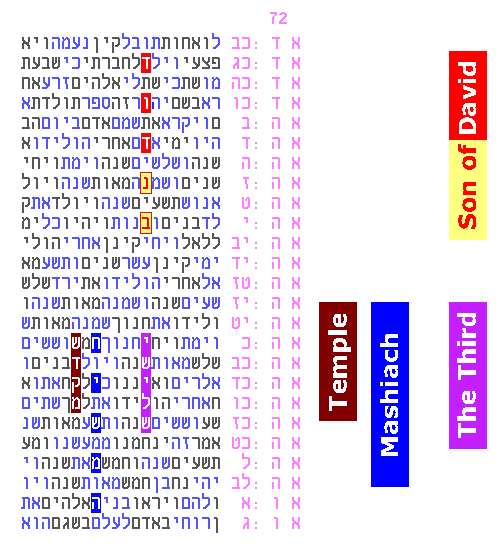 The highly structured organization and low probability of Figure A below (wherein many individual tables are already at the 1:10,000 level or lower) are themselves significantly strengthened by the above new repeating results. From Dec 2012 and April 2013 - Torah Codes Crossroads: We have come to a crossroads in codes research. Many simple but subtle observations, over years of research and reflection, are beginning to "gel". We are beginning to realize that many of our old favorite "pillar" codes - the highest impact codes with highest relevance - are inter-connected to the same foundation. The effect is dramatic enough so that we believe we are seeing the dawn of "second generation" codes - that is, families of interconnected tables, that "know about each other". Below is the accumulated vocabulary from the pillar codes that are all connected to one foundational table (Mashiach, son of David, Third Temple). This is our first, "prime example" of second generation codes (click on each one to see the original table):