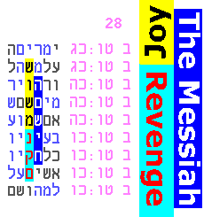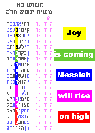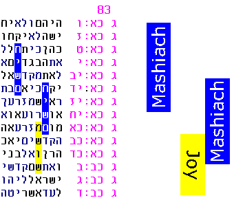 "I am Hashem your G-d" is itself a repetition of former codes and was discussed previously here. In conclusion, if we look carefully we can find inspiration in the multiple dimensions of repetition: in codes and in the text; in dreams, in deeds and mis-deeds; and most of all, as a reminder to rectify those mis-deeds. It worked for Yosef, Yehuda and Moshe. May it also work for us. September 2013 - more about Joy and Mashiach: The simplest result from 2013's research is in Figure A (a few pages below), especially repetitions R2 and R3. These show the repeated clustering of "Joy" with "Mashiach", and "Rejoice" with "Mashiach". Further repetitions have just come to light. First, the original table containing the overlapping words "Joy" and "Rejoice", contains yet another overlapping word, "he will gladden" (translated as it is used, for example, in the plain text of Deuteronomy 24:5).