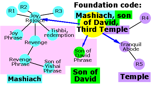 Figure A Click here, or on the above chart, to see how each code leads to the next. All codes flow from the foundation code (yellow circle), first found in the late 1990's and still one of our favorites. Now that we realize that each of these pillar codes are connected to the same foundation, we understand that there is an unshakable structure which firmly roots the pillars. It may be premature to call these "direct messages" but certainly they provide a "vocabulary of meaning". It is important to note as well, that the above Mashiach phrases have all been rated by teams of Hebrew speakers in previous years and have all ranked near the top when compared with thousands of control phrases gathered from long ELSs found in monkey texts. Much of this work is documented here and here (see January 2009 update near the bottom). August 2012 - Codes that "foretell" other codes: The topics at the upper left involve new findings that were in some way "pre-announced" by other codes previously reported on this site. One set of new results can be found on the Joy and Messiah page. Another set springs from the very first find, from 2008, involving G-d's Names: