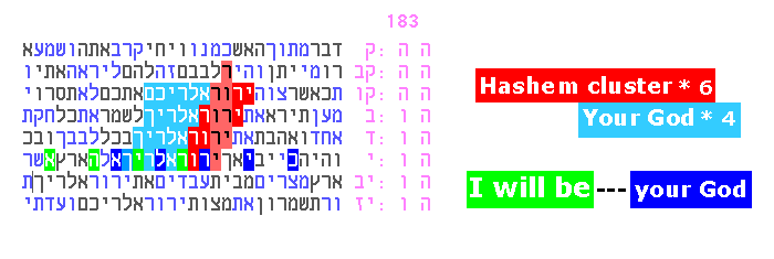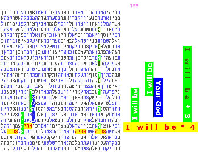 The original search that produced the above result was simply to find the most compact and parallel arrangement for the three key words in red (these are His Names which appear in the plain text of Exodus 6:2-6:3 - which is Hashem's own "commentary" about His Names). Now, four years later, we take a deeper look at the words that immediately appeared back then. First, we explore the "response" (yellow) indicating "I am" and "your G-d". Second, we explore the phenomenon (in blue) of the clustering of "Hashem" (the Tetragrammaton). In both cases, the above pages display repetitions of these elements which are direct, simple, and strong. This kind of repetition provides the observant onlooker with some of the best evidence that the codes phenomenon is real, for two reasons: