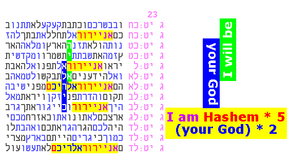 At this very small skip of 23, this 2-word phrase ("I will be"; "your G-d") appears within a string of 5 expressions from the plain text "I am Hashem", 2 of which also indicate "your G-d". Next, we find: