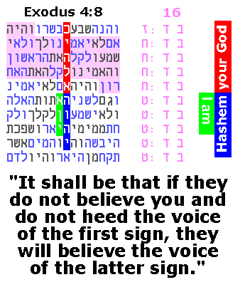 So it appears that we are uncovering a growing number of interlocking and inter-validating instances of Hashem's Names which are nothing less than a Network of Signatures. And by the way, Happy Purim! January 2014 - repetitions: surprises that inspire Let's step back from our usual mathematical pursuits and examine the power of repetition - as it applies to the text itself and to codes. The repetition in the plain text of the Torah uncovers deeper meanings and understandings - both for the characters in the Torah and for us as readers. We detail here one example about Yosef's dreams (click on it, it's worth it). We see something similar with Yosef's brother Yehuda, the ancestor of "Mashiach ben David". Yehuda came into his greatness, his leadership, as detailed here. As these examples show, when even a few words are repeated, but those words are very unlikely and very well-targeted, it stops us in our tracks. The Torah itself highlights the importance of repetition. When Yosef interprets Pharaoh's two dreams, he indicates that they are really a repetition of the same thing. Yosef says that G-d repeated the message because He stands ready to carry it out (the seven years of plenty followed by seven years of famine - see Genesis 41:32). The Torah also discusses a repetition of signs. When Moses asks G-d how the people will believe Who sent him, G-d replies that Moses is to display a few miracles (signs) for the people. If they do not believe the first one, they will believe the second one (Exodus 4:8). This passage contains one of my favorite codes ever,