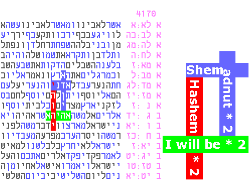 "Your G-d" appears among two clusters containing a total of 9 appearances of "I will be", two of which (bottom right) form the expression in the plain text "I will be as I will be". This is Hashem's answer to Moshe in Exodus 3:14, when Moshe asks "who shall I say sent me", so that the people will know it was really Hashem. Hashem's "signature" is now extended by these two new clusters, which have a combined significance well beyond 1:1000. The same is true for the following cluster, which also has Exodus 3:14 as its base (a fact that also boosts the significance): March 2014 - part II - The three Names from the Sephardic and mystical traditions The Siddur (prayer book) used in Sephardic synagogues emphasizes three Names of G-d. Two of them, Shem Adnut and the Tetragrammaton ("translated" here as Hashem) are printed throughout the Siddur, either one inside the other, or by weaving their letters together. In the case of special Siddurim that incorporate mystical teachings from the Baal Shem Tov and the Arizal, "Ekieh" ("I will be") is written in columnar format alongside the other two when focusing on the central "Shma" prayer, and when focusing on the wearing of tefillin. These three names appear in code, twice each, in a maximally compact and overlapping configuration, with significance beyond 1:10,000: