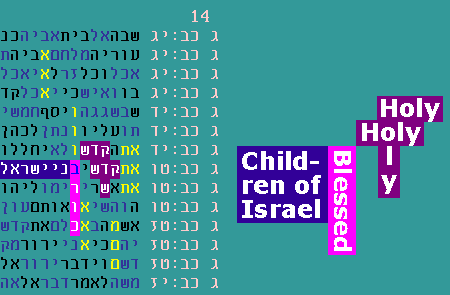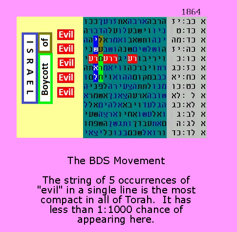 Read here about BDS propaganda, and how such distorted claims and lies have come to be believed. The movement receives support by deviously portraying itself as a champion of universal values, but only those willing to look closely see its destructive aims for what they are. The currrent wave of stabbings and car rammings against citizens of Israel is now an embarassment to some in the BDS movement, while others actually use the BDS lies to justify such violence. In any case, the above code is particularly simple and stong. I discovered it after reading the above article, and after already having seen some moderately strong precedent codes, where "evil" was repeatedly associated with the current terror wave. Technical details: Although "evil" is only 2 letters, reish-ayin, the protocol I use is very constricting and applicable to many situations (see for example the word "yes" in the watchmaker codes from June 2015 below). The protocol permits the 2 letters to be either immediately adjacent, or in the case of the 11 less frequently appearing letters (ayin being one of them), the 2 letters can be separated by at most one vertical or horizontal intervening letter. With this protocol, there are 5 such occurrences in the horizontal red-highlighted areas above, which is more than is found in any other short, contiguous (1D) string in Torah. February 25, 2016 - Secrets in the letters. Tzimtzum: I recently learned more about the idea from Kabbalah that G-d contracted himself (called "tzimtzum") when He created the world. Rabbi Noam Elimelech included the idea that G-d actually hid Himself in the letters of the Torah. That is an incredible reinforcement for one of my favorite code series (re-linking here to the result from last October). October 7, 2015 - Specially marked codes (insignias) "Specially marked codes" are now providing a demonstration of intention like we have never seen before. See for example the doubly and triply stacked letters below, in the two July entries. This clustered stacking could be thought of as an insignia - a stamp of authenticity. These concepts are demonstrated, in an even bigger way, by Tim Brooks, here (the latest member of the 1 in a million club - the same link re-emphasized above). After more than 18 years of research I can say that this is a big deal - yet easy to miss if one blinks. It is easy to miss how an already interesting code jumps in significance when it is marked with an insignia, but this is now a very measurable and significant result. July 29, 2015 - Holy children of Israel Following closely the pattern set below (see Holy land of Israel, July 16), the following code started with a triple appearance of "holy". There are a few dozen of these in the Torah with small skip (under 50), but this one had the additional reinforcing pattern of vertically stacked letters - this time triply stacked letters, not just doubly stacked (see yellow highlighted letters). Whereas 0, 1 or 2 such triples are the norm for a table this size, 6 or more is extremely rare. Further, the only relevant vertical 4-letter word in the area is "blessed", which hugs two of the triple letter stacks and meets with the common theme, "children of Israel". So comparing to July 16, we now have 2 common patterns and a common theme, and again significance much higher than 1:1000.