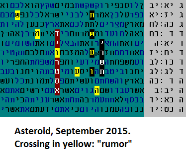So the same message occurs independently in three ways - vertically, horizontally, and in an extremely compact cluster. Five occurrences of "yes" in this new cluster added another hint that we are looking at a real message here. These hints became less and less subtle as we ran a series of experiments that studied the extent of repetition of similar key word sets across thousands of monkey texts. The combined result bypasses the 1:10,000 probabliity threshold. Note also - the spelling of "exist" comes from Daniel 6:27: ... He is the living G-d and exists forever ... May 17, 2015 - Asteroids and other rumors This is why I stay away from codes that predict. They can be completely misleading. The following code, appearing in a recent youtube video, is just one example of why. The word "asteroid" (in red), near "September" and "2015" (both in black), seems rather foreboding. Look at what happens, however, if we dig deeper. We come away with a completely new meaning once we notice an additional significant word, "rumor", crossing the code diagonally in yellow:
