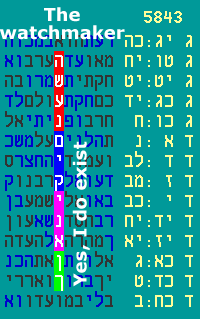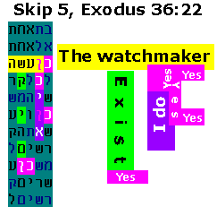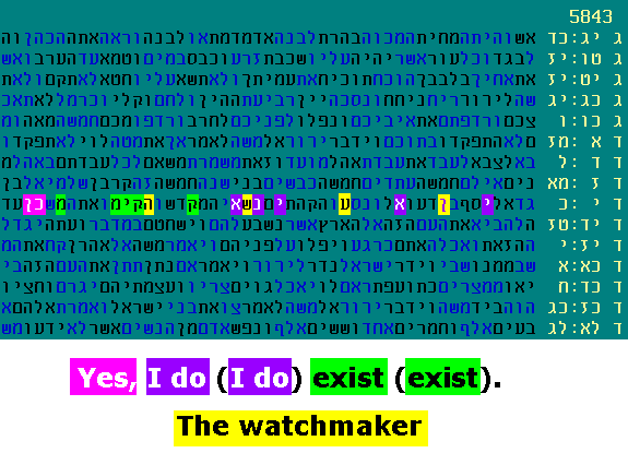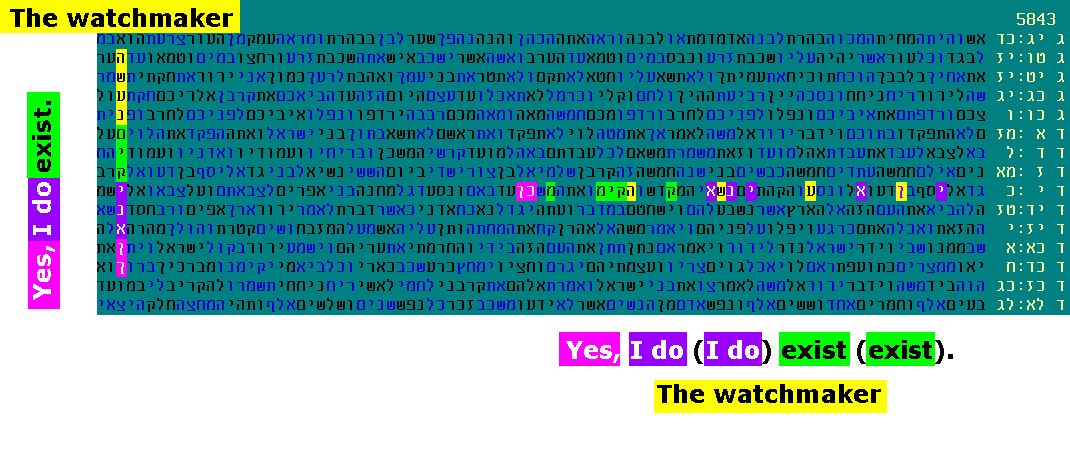 In addition to the high significance of this compact arrangement, there is something very unusual going on, a reinforcing phenomenon. I just happened to notice that 20 letters, shaded in yellow, hug the code and each other. These letters are formed by 10 vertical "doubles", i.e. reish above reish, beit above beit, mem above mem, etc. Initial calculations, now confirmed via Monte Carlo runs, indicate that this is by itself significant, at far more than the 1:1000 probability level. June 2, 2015 - Not so subtle hints Do the codes give some hints about how the universe came to be? There is a "watchmaker" analogy made famous by William Paley in his book "Natural Theology". Paley argued that the complexity of a watch implies a watchmaker, and all the more so, the complexity of the universe implies a Creator. As of this month, we now know about three different codes that refer to this. It started with this encoded phrase that Professor Rips shared with me last year: