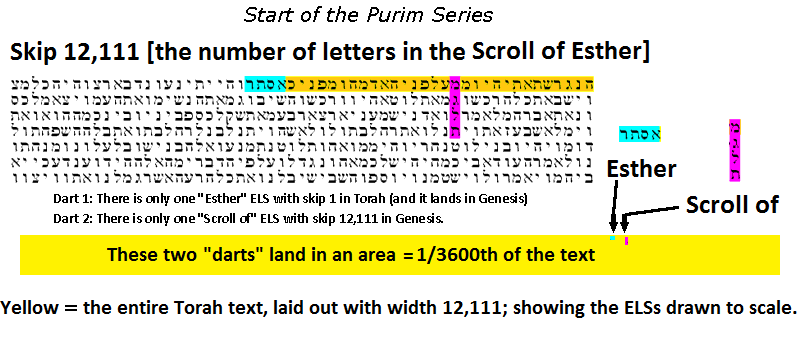 These codes are about the Scroll of Esther, one of the books of the Old Testament, which tells the story of Purim. The book is exactly 12,111 letters long, and that is the skip that these codes restrict themselves to. This is a dramatic restriction, such that the words being searched typically appear just once or a few times in the entire Torah with that skip. The above code has chances approaching 1:1000 of being there just by chance, easily demonstrated by using a random "dart throwing" approach. It takes almost 1,000 blind dart throws into an area the size of Torah, to result in the two ELS "darts" landing so close together (just based on the text size and number of "darts"). Many of the related codes have even less chance of appearing randomly, i.e. their intentional appearance in the text is virtually certain (they were measured by a similar dart throwing exercise, and/or comparisons to thousands of "monkey texts" where we expect no codes). Lessons to learn from these codes: 1) One must measure a code's likelihood before giving it any serious consideration. Prolific codes, or those proclaiming new "revelations" or future events are best taken with a mountain of salt. 2) Measurements are only valid if the words involved are "a-priori" in some way (known in advance, or repeated strongly in particular ways from previous results). Lacking this requirement usually means that the cited probabilities are off by a million. 3) Unfortunately, few published codes are measured, and of those, few are measured correctly. 4) This series is one of the best demonstrations of the reality of (correctly measured) significant codes. 5) This series is intriguing and awe-inspiring to anyone who becomes familiar with the story of Purim. The Torah was given 3300 years ago but these codes indicate that the Torah's Author knew about the Purim events which would unfold 900 years later. March 9, 2016 - Evil