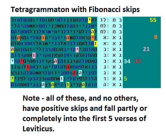 November 26, 2017: Great Rabbis revisited Great Rabbis revisited - 20 year puzzle solved here!. This result is so much easier to verify than the original work; yet it reaches the same conclusion. March 31, 2017: News item Two articles down (Sept 25, 2016) a new estimate for this showcase result (Rashi's commentary reflected in codes) is now 1:1M. This extends, and is independent of the original result, which was also at the 1:1M level. October 6, 2016: The Tetragrammaton forms a famous pattern Here is another extremely simple and strong result. The Tetragrammaton (the Divine Name), occurs 6 times with positive skips under 100, in the first 5 verses of Leviticus. That is not unusual. What is amazing, though, is that the skips for these 6 ELSs are all consecutive numbers in the Fibonacci series: 5 (see green letters below), 8 (orange), 13 (red), 21 (pink), 34 (blue), and 55 (yellow). The Fibonacci series is found throughout nature - in pine cones, sunflowers, shell spirals, etc - check out google images for Fibonacci Series - and it is related to the golden ratio.