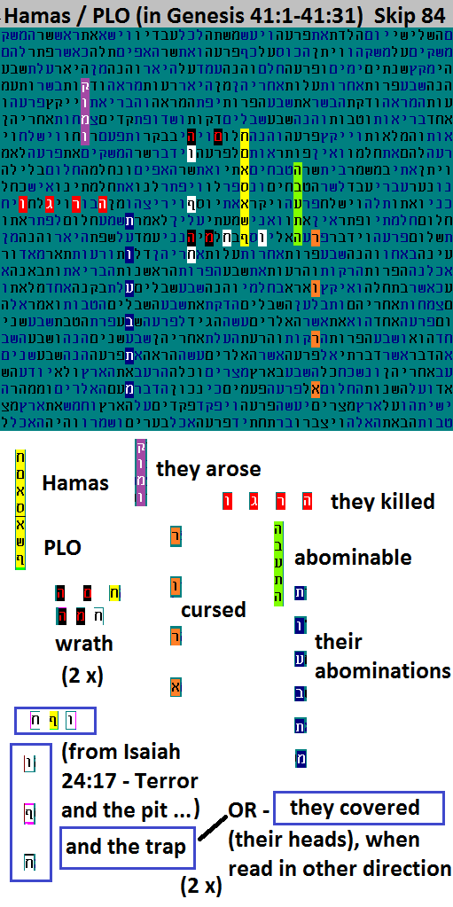 As we saw, this example was 'locked in' (via identical patterns) to a (literally) 1-in-a-million class of codes about mountains in Torah. The mountains are un-named, but the commentators (Rashi and others) name them, and the code contains those same hidden names. Now, we take another look at the same 'target' (the above Deuteronomy verse), examining further comments by Rashi. If you've been around this web site, you know that a rare and repeating event is statistically extremely unlikely - as unlikely as a repeating airplane hit into the Twin Towers being unintentional. As shown here, the target is hit again and again, as discovered by Ephraim Yakir. These extended Rashi comments are reflected in the code to the extent that 7 of the 9 words that one could search for (excluding connectors and pronouns) are found near the same short passage. The conclusion is that these extended finds exceed the 1:1M significance level on a series that was already 1:1M (this estimate was updated on March 31, 2017). What's more, Rashi, who lived from 1040 to 1105 and whose teachings are still a centerpiece of contemporary Jewish learning, was commenting at the time on a document over 2000 years old (the Torah) and that document apparently "knew" about him from its inception. Finally, the original code comes from the work of Dr. Alex Rotenberg, who did extensive research on Rashi and codes here. When one is first exposed to Dr. Rotenberg's results, it is difficult to guage how many commentaries by Rashi were used and how many were bypassed, since Rashi was so prolific. However, we have just seen that the extended comments for this showcase example are found as additional codes in the same place. So the above very good question is superceded by an even better answer - the double targeting (repetition) succeeds again, and we are enlightened as to the codes' reality once again. July, 2016: Hamas / PLO This code started with a single string, in yellow, "Hamas/PLO". There are an amazing number of appropriate surrounding words with high relevance, high compactness and high connection to each other. Many of them repeat as well. A sampling is shown here: