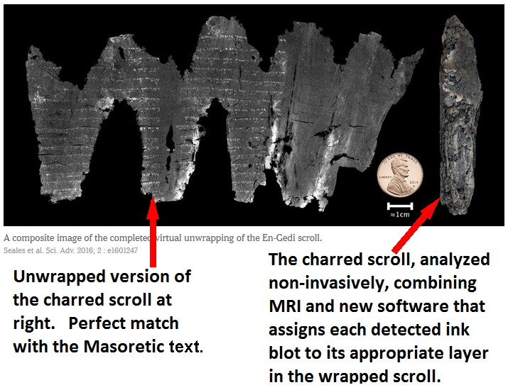 [ Note also! The Aharon cluster (see table titled "Leviticus Cluster" here), was an intriguing and early result (late 1970's) by Professor Rips and it also uses the beginning verses of Leviticus).] Recently, an ancient, burned scroll containing the beginning verses of Leviticus, between 1800 and 2000 years old, was "virtually unwrapped" and read (see NY Times article). Every one of the 200+ letters that are readable in this scroll match exactly with the Masoretic text of the Torah, which is what we use in Torah Code research.