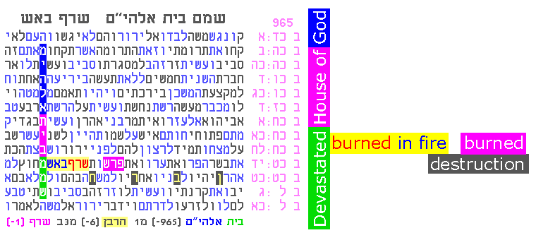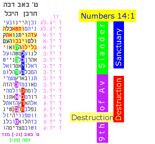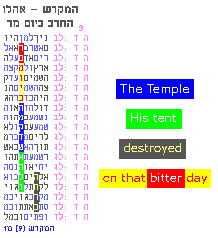 The following extraordinary table (Fig. 1) describes the destruction of the Holy Temple. This table, and several related results, all center on the same verse, Numbers 14:1, as described in Professor Rips' report. Fig. 1 Two additional tables, found independently from the first, address the same event (see Figs. 2 and 3). Fig. 2 Fig. 3 The common theme of destruction links these tables together and leads us to more extensive research that demonstrates how a starting code can "choose the key words" used in follow-up codes, thereby removing the human element of subjective decisions [see the research in 2009-2010 for increasingly simple examples].