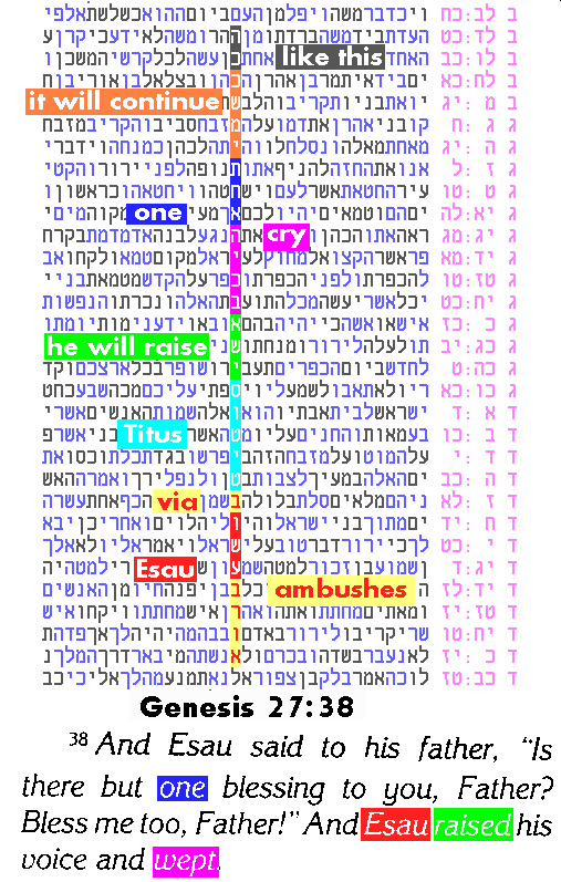 Titus and exile Below is a long phrase with both mathematical significance and deep meaning, alluding to the momentous destruction caused by Titus. Titus was the Roman Emperor who led the war against Judea, conquering Jerusalem, destroying the Holy Temple and exiling the Jewish people (see J. Flavius, The Jewish War). This exile has continued for almost 2000 years, the major portion of Jewish history. "Esau ambushes via Titus; he will raise one cry; it will continue like this". Note the code's "echoing" of 4 words from Genesis highlighted at bottom. The historical significance Actually, there are three separate allusions, all subtle and profound: (1) The appearance of Esau in this code is especially interesting because the Talmud (Gittin 56b) indicates that Titus descended from Esau. And famous Kabbalist Rabbi Menachem Azaria of Fano even says that Titus was a reincarnation of Esau. (2) Jewish history has unfolded based on the vision in the book of Daniel (chapter 7), which says that the Jewish people will be subjected to the dominion of Four Kingdoms (Babylonian, Persian, Greek, and currently Roman, also known as the Exile of Edom or Esau). Early Jewish sources (Pirkei Rabbi Eliezer, ch 35, and the Ramban's commentary on Torah) state that the dominion of the first three kingdoms was for a known amount of time, unlike the fourth one, the Exile of Esau, which continues to this day without having a known end. This is precisely reflected by the last component of our phrase, "it will continue like this". (3) According to the Torah, the origin of Esau's enmity to Jacob (Yaakov) was the bitter rivalry over their father Isaac's blessings. When Esau realized that the blessings were given to his brother Yaakov (Jacob) and not to him, "Esau raised his voice and cried." (Genesis 27:38). The middle part of our phrase is actually a paraphrase of this quote. We can see the tight link between all three parts of the code from the Zohar, which states, "these [Esau's] tears lowered Israel into exile. As soon as [the influence of] these tears will cease, through the weeping of Israel, they will come out of the exile." (Zohar Shemot 12b) The mathematical significance There are a few possible methods for measuring the significance, including one proposed by Professor Rips which makes use of Claude E. Shannon's concept of language entropy. However, for the time being, let us focus on a method which yields a less significant outcome, but is simpler to explain. We note that our phrase contains four words that are derived from the verse referred to above, Genesis 27:38, namely: {Esau; will raise; one; cry}. To estimate this observation quantitatively, we produced a population of random ELS strings to determine how many of them contain words derived from this verse to a comparable extent. We generated a population of 280 million such strings, with similar lengths and numbers of words as "Esau will raise one cry". We found that only 103 of these contained four or more words derived from our verse (and we permitted variations in the grammatical derivations that were more generous than those seen in our original phrase). We submitted these 103 to a review by 2 Hebrew speakers, who determined that (at most) one of them makes grammatical sense (on par with "Esau will raise one cry"). Thus 1:280 million is the raw score, to which we apply a factor of (approximately) 6,000 total verses in Torah, yielding a final probability of 1:46,700. |