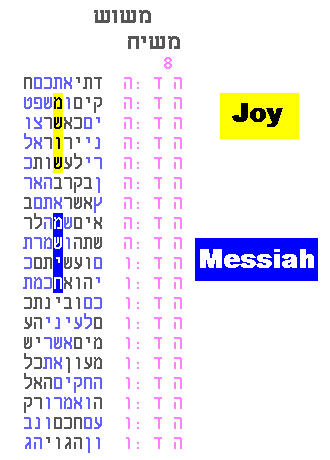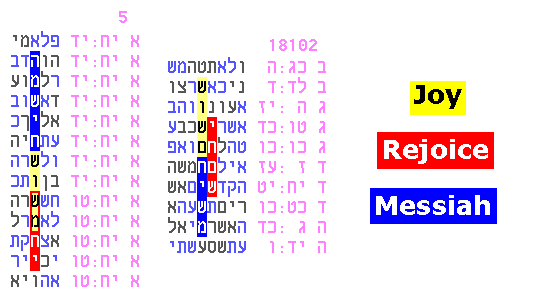 Joy and Messiah (updated Aug 2012) This set of results - even more than others on this site - repeatedly shows how simply and directly one code "pre-announces" another - like one crossword puzzle intentionally set up to give the clues to another crossword puzzle. The power behind these codes is not due to new information that they contain - we will see "only" that words like joy are associated with Messiah - but we will also see an unmistakable intention. This entire page of results starts with the minimal skip of "The Messiah" (skip 5) which contains two adjoining and overlapping words, "joy" and "rejoice", in the same column (left half of the Figure 1 below). When the phrase "Messiah, joy" was searched elsewhere in Torah, it also formed an unusually compact meeting with "rejoice" to the tune of 1:2,500 (20 competitors were found in a search of 50,000 monkey texts - right half of figure).