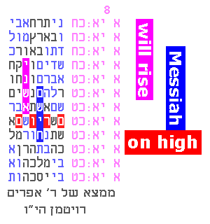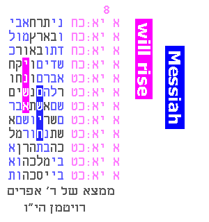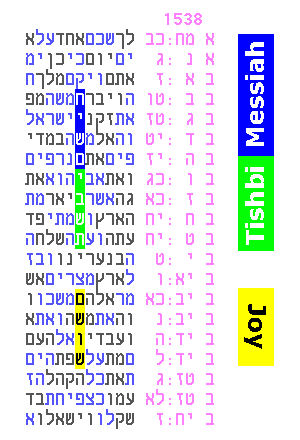 Figure 1.2 (re-displayed) In fact, we find 2 highly relevant extensions, "he will redeem them" and "Tishbi" (Figure 1.2a below). "Tishbi" is explained as follows: Jewish tradition says that "Elijah the prophet" (Eliyahu in Hebrew) will usher in the Messiah. Elijah is known as the "Tishbi". In fact, throughout the Gemara, when there is an unresolved question, it is labelled as "takou" (תיקו) which means "let it stand" and has become an acronym for ואבעיות קושיות יתרץ תשבי (Tishbi will resolve all questions and problems), which refers to Elijah. Also, when the Sabbath ends, the traditional song that we sing is "Eliyahu HaNavi [the prophet], Eliyahu HaTishbi, Eliyahu HaGiladi [resident of Gilad], bimharah yavo aleinu [quickly come to us] im Moshiach Ben David [with Messiah, son of David]". Therefore these two personalities being together in the code, "Messiah and Tishbi", is quite fitting.