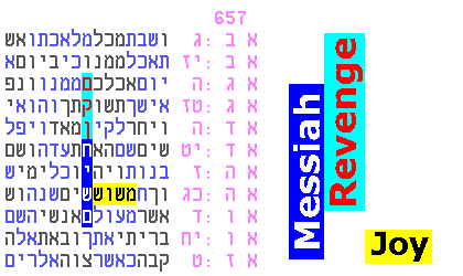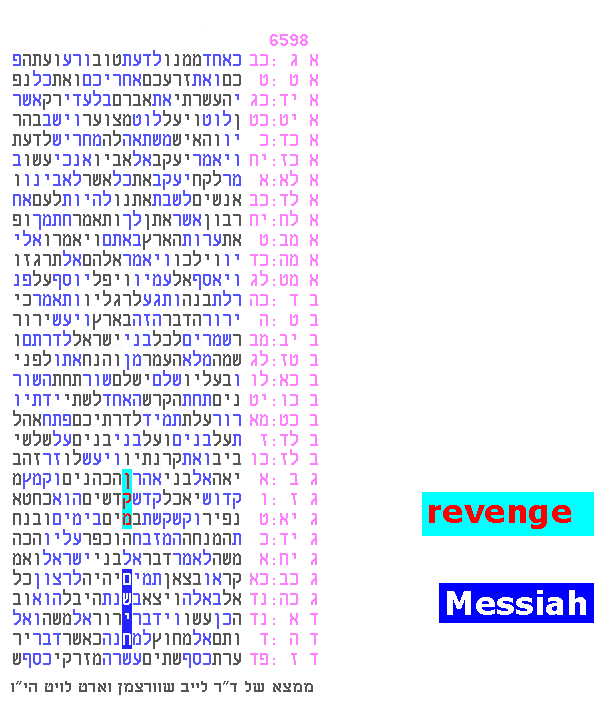 Figure 1.3b And the grand prize winner is a code we have studied extensively in the past, which can be built up from our new starting words, Messiah and revenge. Skip 6598 is actually the 13th minimum for same-column codes containing both key words within two rows of each other and running in the same direction:
