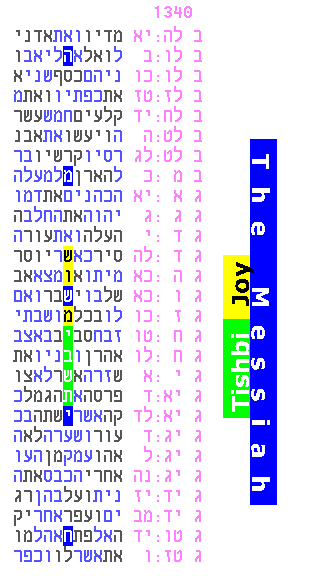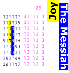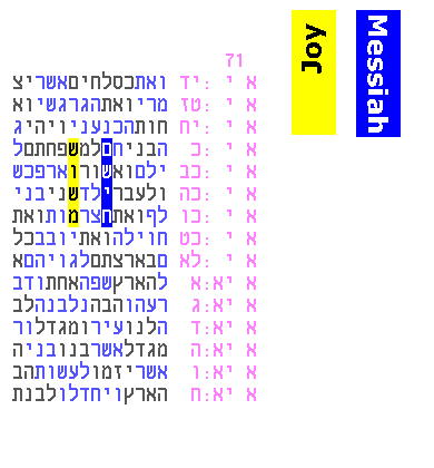 Figure 1.1a Above, the original words, joy and Messiah, are connected to each other with three other words to form a much longer, meaningful phrase. The probability of the bottom component, "will rise on high" appearing by chance in a Messiah-related phrase was previously calculated to be near 1:800 (see the "component analysis" at the bottom of this page). We consider these extensions to the original words as clues to yet more codes, so we add them to our vocabulary, along with the original words, joy and Messiah. And we now ask our standard question: Is there a further offshoot - can we find an additional "crossword puzzle" with some of these same words?