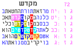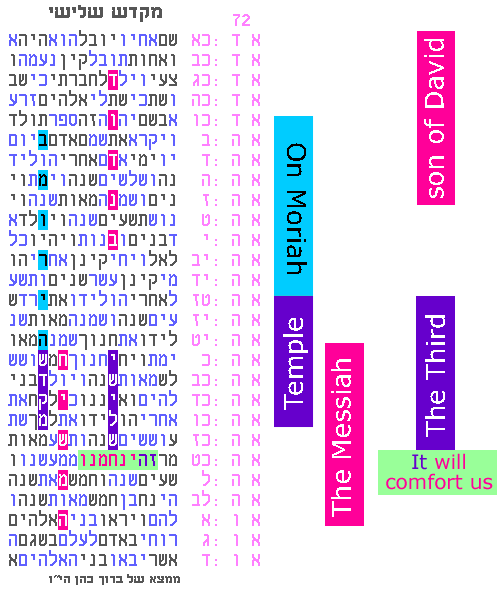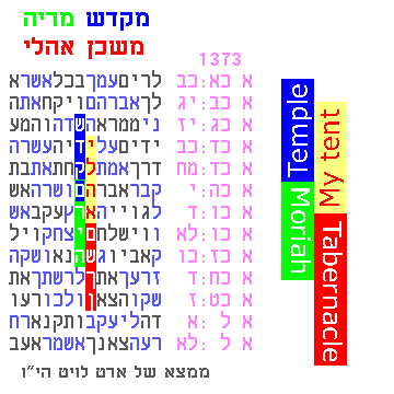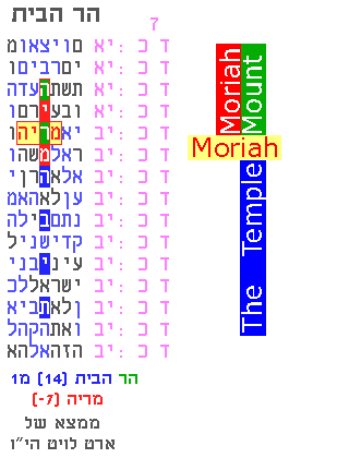 Rebuilding of the Holy Temple According to tradition, after the calamitous destructions of the First and Second Temples, and the many centuries of exile following, the Holy Temple is destined to be rebuilt. This rebuilding will be lead by the Messiah, son of David, to usher in a golden age for the Jewish people and all of humanity. Following is an extraordinary code depicting this: Fig. 1 This code was discovered in the late 1990s by Baruch Cohen. Although it is a showcase example, we do not assign a p-level for it, because there are other alternatives for some of the key words. But something extraordinary happens when we actually try the main alternatives - we often find other significant codes. Therefore, rather than detracting from the significance, our widening of the alternatives often adds to the significance. This is a familiar chain of events, which we see throughout this site and in other (old and new) research. For example, we can check alternative names for (1) the Holy Temple and (2) its location. To keep the process simple and limited, we will look at only those two aspects; we will not at this time delve into alternatives for the idea of redemption (i.e. the Third Temple and the Messiah). For the location, an alternative spelling for Moriah (above it is spelled מוריה) is מריה ; and the most widely used alternative for Moriah is "Temple Mount" (הר הבית). A very interesting table results from these alternatives, with extremely small skip, 7: Fig. 2 For alternative names for the Temple (both the permanent one, and the temporary version used in the desert, in the Torah), I made a list of the common terms that I was familiar with, which are used throughout the Hebrew Bible (Tanach). This included: משכן (Tabernacle or dwelling place of G-d), אהל מועד (Tent of Meeting), היכל (Sanctuary), בית אלהי"ם (House of G-d) and בית ה (House of Hashem). I favored trying משכן (Tabernacle) first, being influenced by the following code (found in the same timeframe as Fig. 1; it is located in the same area of the text, and has a similar theme; and it has a rare parallel configuration for two long and related strings with small skip): Fig. 3 Based on the above, my first search that involved alternative names for the Temple, was to look for any interesting subset of the following: משכן (Tabernacle), מקדש (Temple), מוריה (Moriah spelling 1), and מריה (Moriah spelling 2). The following extraordinarily strong and compact table (Fig. 4) resulted: Fig. 4 Another former result, relevant to this discussion, is simply מקדש (Temple), in a parallel meeting with itself in Fig. 5: Fig. 5 Temple also crosses with the same word in the text, twice, and with קדש קדשים twice (Holy of Holies - the holiest, innermost area of the Temple). More alternative searches are possible, and are likely to uncover additional hidden successes, based on what we have seen so far. The conclusion that is gaining momentum: This process of widening the search is a major source for finding hidden successes, and for reinforcing the original result simultaneously.
